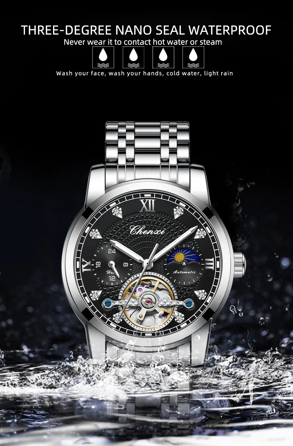 CHENXI Mens Mechanical Watches Top Brand Stainless Steel Automatic Watch Men Waterproof Business Wristwatch with Luminous